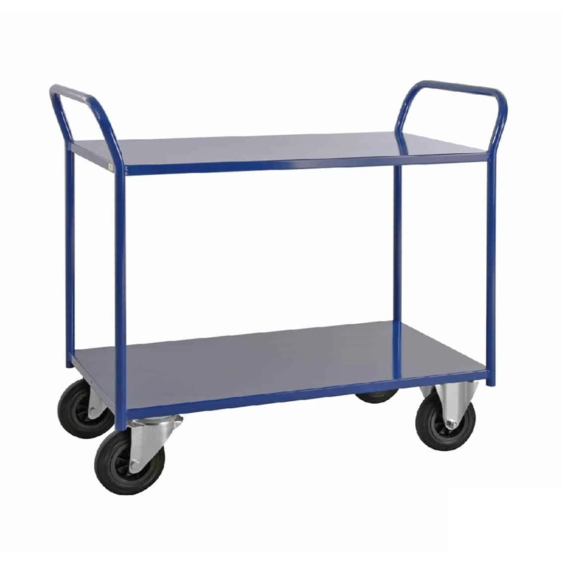 Dette er en blå rullevogn, 1080x450x975 mm, med 2 hylder. Rullevognen er lavet i stål med blå pulverlakering og har 2 faste hjul og 2 drejbare hjul. Rullevognen kan klare en maks belastning på 400 kg. Rullevognen er nem at rengøre efter brug.