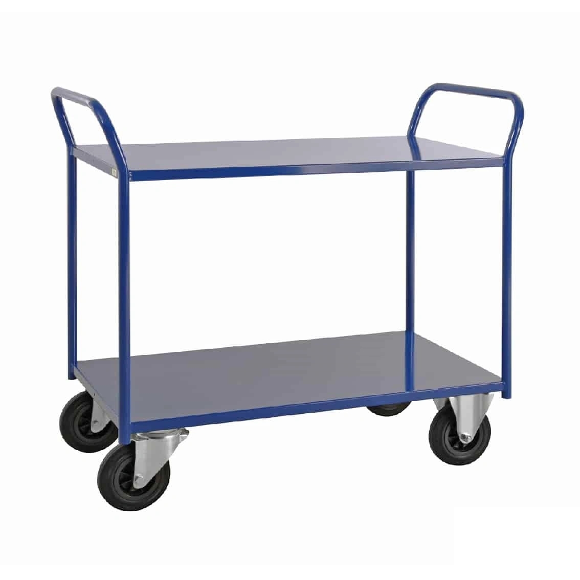 Dette er en blå rullevogn med bremse, 1070x550x1000 mm, med 2 hylder. Rullevognen er lavet i stål med blå pulverlakering og har 2 faste hjul og 2 drejbare hjul med bremse. Rullevognen kan klare en maks belastning på 400 kg. Rullevognen er nem at rengøre efter brug.
