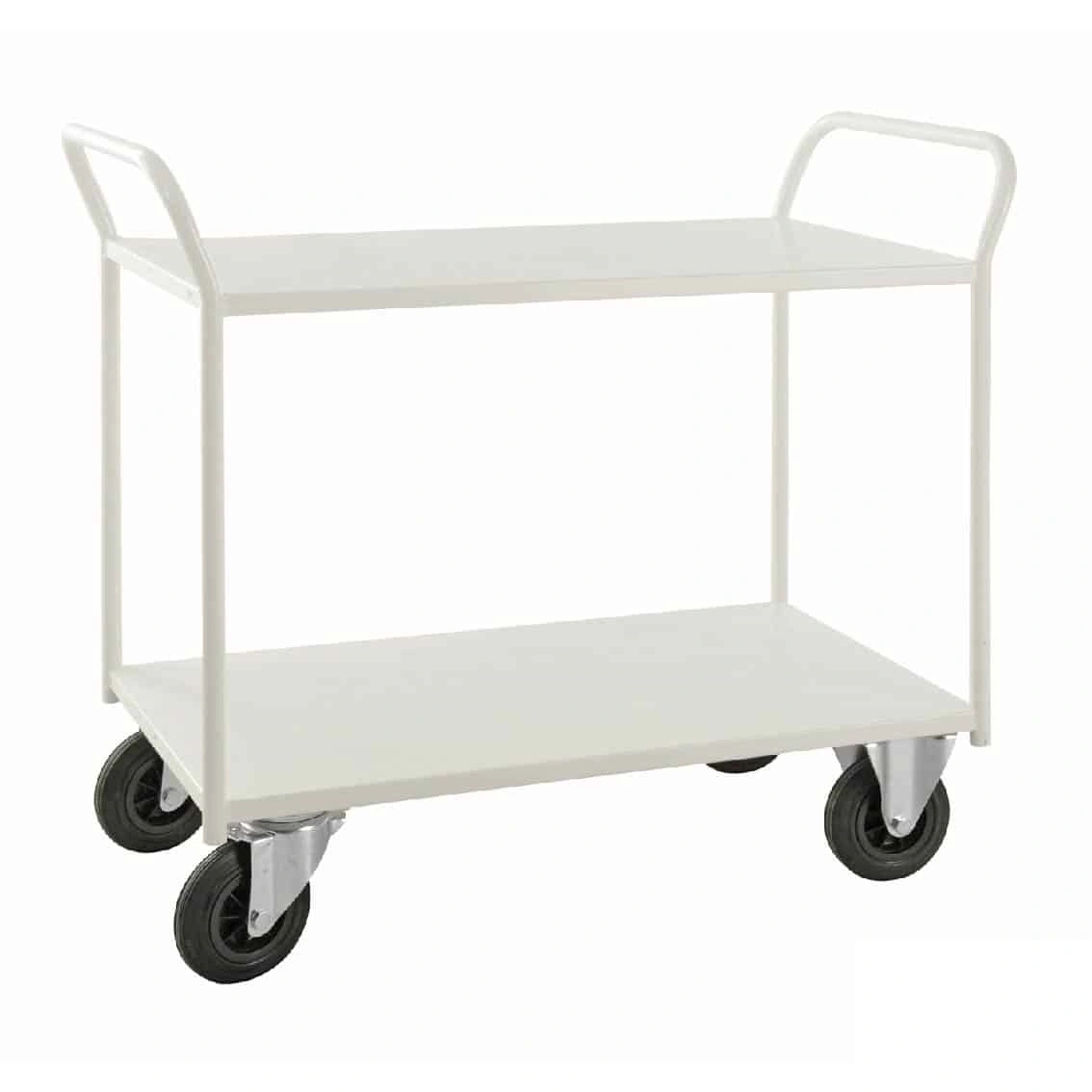 Dette er en hvid rullevogn, 1070x550x1000 mm, med 2 hylder. Rullevognen er lavet i stål med hvid pulverlakering og har 2 faste hjul og 2 drejbare hjul. Rullevognen kan klare en maks belastning på 400 kg. Rullevognen er nem at rengøre efter brug.