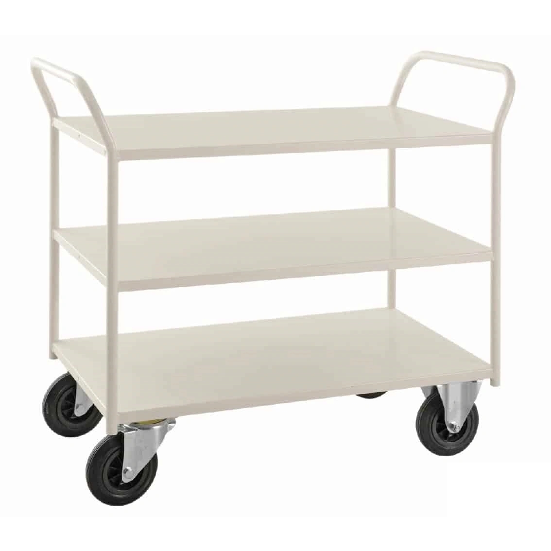 Dette er en hvid rullevogn, 1070x550x975 mm, med 3 hylder. Rullevognen er lavet i stål med hvid pulverlakering og har 2 faste hjul og 2 drejbare hjul. Rullevognen kan klare en maks belastning på 400 kg. Rullevognen er nem at rengøre efter brug.