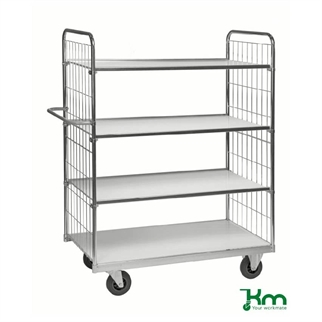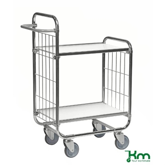 Dette er en Hyldevogn med 2 laminathylder, 1190x650x1025 mm, fra den svenske producent Kongamek. Hyldevognene og rullevognene har justérbare hylder, så du selv kan bestemme hvor mange hylder og hvor langt der skal være mellem hylderne på din hyldevogn. Hyldevognene er oplagte til industri, i køkkener, på lageret eller som plukkevogne. Udover vores sortiment af hyldevogne og rullevogne, kan du også tilkøbe ekstra laminathylder eller hyldedelere til din hyldevogn. Alle hyldevogne er produceret i elforzinket stål.