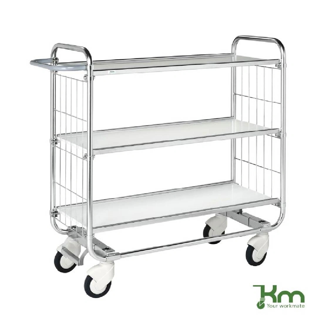 Dette er en Hyldevogn med 3 justérbare hylder, 1395x470x1120 mm, fra den svenske producent Kongamek. Hyldevognene og rullevognene har justérbare hylder, så du selv kan bestemme hvor mange hylder og hvor langt der skal være mellem hylderne på din hyldevogn. Hyldevognene er oplagte til industri, i køkkener, på lageret eller som plukkevogne. Udover vores sortiment af hyldevogne og rullevogne, kan du også tilkøbe ekstra laminathylder eller hyldedelere til din hyldevogn. Alle hyldevogne er produceret i elforzinket stål.
