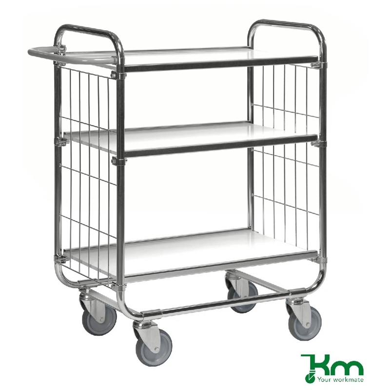 Dette er en Hyldevogn med 3 laminathylder, 1195x470x1120 mm, fra den svenske producent Kongamek. Hyldevognene og rullevognene har justérbare hylder, så du selv kan bestemme hvor mange hylder og hvor langt der skal være mellem hylderne på din hyldevogn. Hyldevognene er oplagte til industri, i køkkener, på lageret eller som plukkevogne. Udover vores sortiment af hyldevogne og rullevogne, kan du også tilkøbe ekstra laminathylder eller hyldedelere til din hyldevogn. Alle hyldevogne er produceret i elforzinket stål.