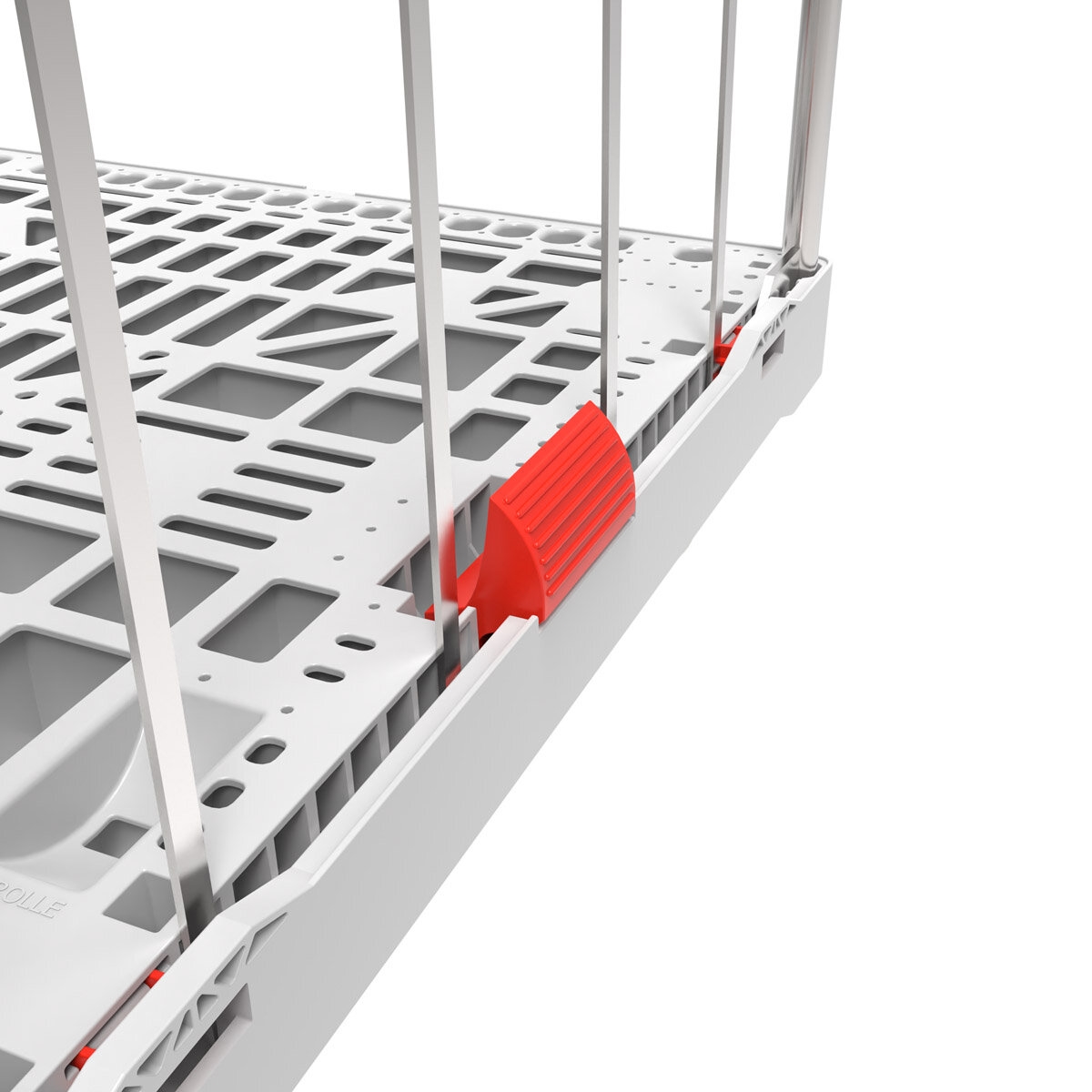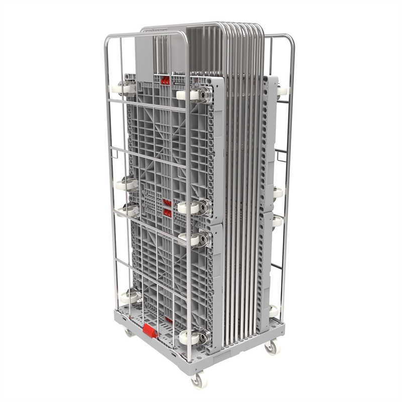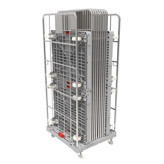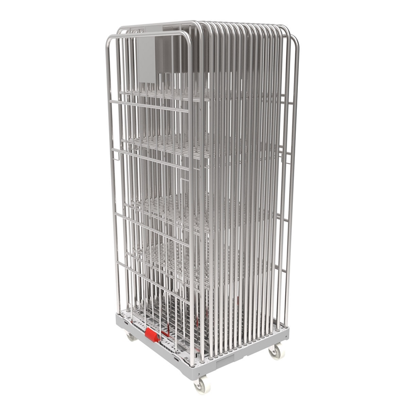 Kompakt transportbur med klips system som gør det nemt at afmontere sidepaneler ved opbevaring og transport. 8 transportbure kan pakkes sammen så de sammenlagt fylder det samme som 2 bure, svarende til en pladsbesparelse på 75%. Det kompakte transportbur er monteret med 108 mm plasthjul. Hylden der passer til buret har varenummer: W70A02PPF57004