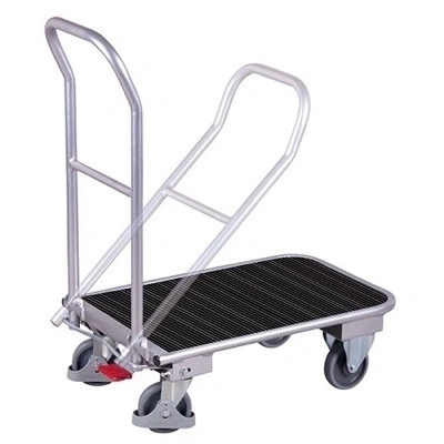 Praktisk og robust kompakt vogn 815x450x945 (BxDxH) monteret med støjsvage og afsmitningsfrie gummihjul. Kompaktvognen kan klappes sammen. Vognen er lavet i aluminium med en sort rillet gummimåtte. Kompakt vognen har en maks belastning på 150 kg.