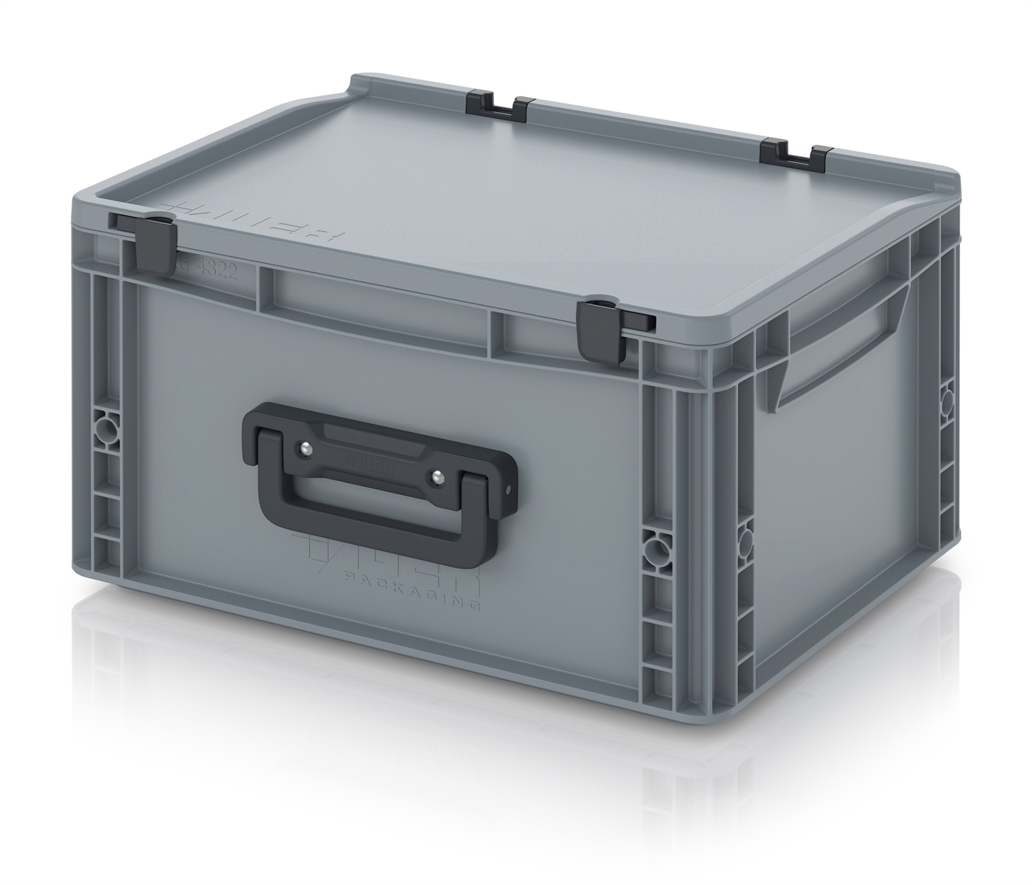 Robust og slagfast kuffertkasse i PP plast. Låget er hængslet på kassens bagkant og åbnes/låses nemt med to kliklåse. Ergonomisk håndtag er monteret på kassens front. Plastkassens bundmål er 400x300 mm og har en højde på 235 mm.