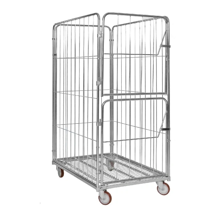 Medium postbur med halvhængt port, 1200x800x1800 mm. Postburet er lavet i elforzinket stål. Rullecontaineren har en egenvægt på 44 kg og en maks belastning på 600 kg. Postburet har 2 faste og 2 drejbare hjul , hvilket gør det praktisk når man skal flytte pakker og andre varer rundt. Den halvhængte port gør det nemt at komme til varer og så mange pakker. Buret kan dog også lukkes, så du kan fragte så meget gods og så mange pakker som muligt.