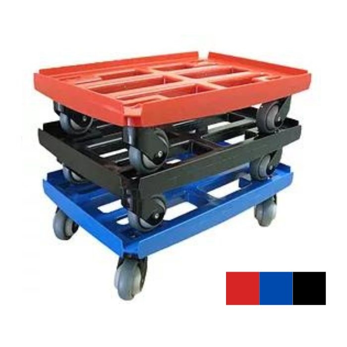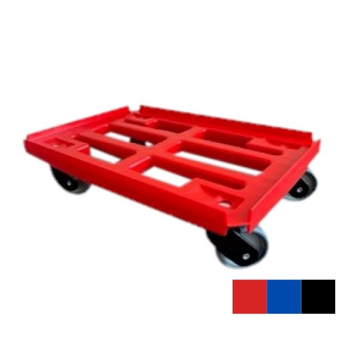 Møbelhund med 4 drejehjul med drejegafler i plast og ribber, som er velegnet til både plastkasser, spande, tønder og alt andet som ikke matcher et EURO mål. Under den solide ramme er monteret gafler i plast som ikke ruster og tåler vask ved 90 grader. Derudover har plastgaflerne en fjedrene effekt som gør kørslen nemmere, mere støjsvang og sikker. Plastgaflerne er monteret med 100 mm støjsvage gummihjul. Møbelhunde og traller er velegnet som vogne til transport og håndtering af plastkasser. Vælg mellem møbelhund i rød, blå eller sort.