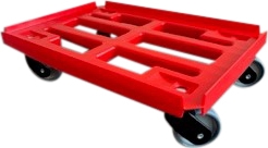 Møbelhund med 4 drejehjul med drejegafler i plast og ribber, som er velegnet til både plastkasser, spande, tønder og alt andet som ikke matcher et EURO mål. Under den solide ramme er monteret gafler i plast som ikke ruster og tåler vask ved 90 grader. Derudover har plastgaflerne en fjedrene effekt som gør kørslen nemmere, mere støjsvang og sikker. Plastgaflerne er monteret med 100 mm støjsvage gummihjul. Møbelhunde og traller er velegnet som vogne til transport og håndtering af plastkasser. Vælg mellem møbelhund i rød, blå eller sort.