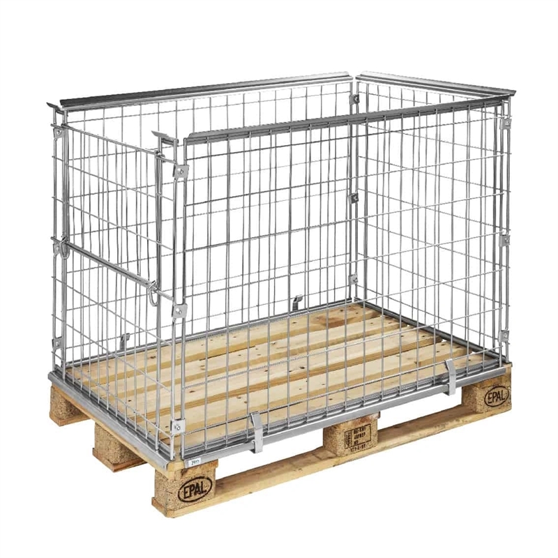 Pallebur til EUR palle med port i enden, 1220x820x870 mm. palleburet passer til en EUR palle i målene 1200x800 mm. palleburet har en halvhængt port i enden, der gør det nemmere at håndtere varer og gods på pallen. pallebure og pallerammer kan stables og er praktiske når man skal transportere gods på EUR paller på en sikker måde. Bemærk at de leveres usamlede. Husk at du kan tilkøbe et gitterlåg til palleburet; KM080040L.