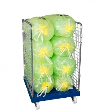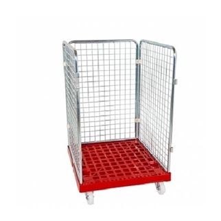Transportbur med 3 sider med stålforstærket plastbund i valgfri farve. Transportburet er monteret med 2 drejehjul og 2 faste hjul, 108 mm PP. Mulighed for påtryk af logo eller tekst på buret.