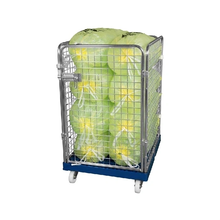 Transportbur med lukket bund, 3 sider og dør. transportburts højde er 1210 mm. Transportburets paneler har en åbning på kun 50x50 mm hvilket gør buret egent til transport af mindre genstande. Transportburets lukkede bund bevirker at buret er egnet som vaskebur, bur til affald eller som transportbur til vaskesække mv. Transportburet er monteret med 108 mm plasthjul. Hylde der passer til transportburet har varenummer: ZBD725ADLC004
