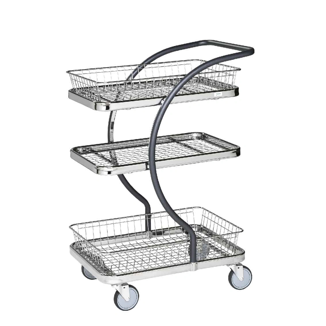 C-line serveringsvogn med gitterhylde og 2 kurve, 685x450x1000 mm. Serveringsvognen har 3 plan; en gitterhylde og 2 trådkurve, samt 4 drejbare hjul. Serveringsvognen er nem at manøvrere med, grundet det unikke C-line design, der gør den elegant og anvendelig på restaurant, hotel eller kontor. Vognen har en maks belastning på 120 kg.