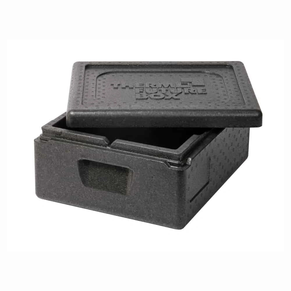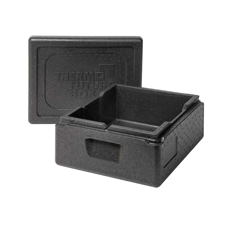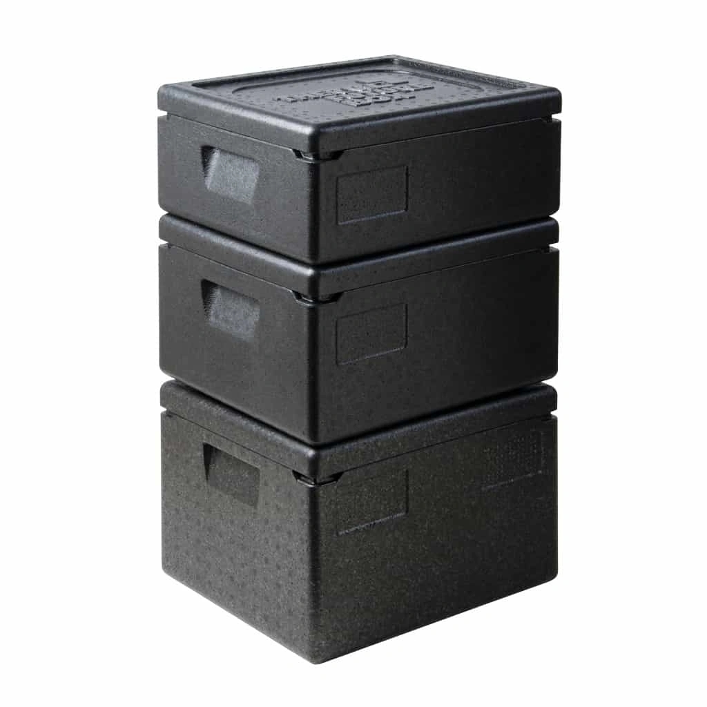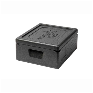 Termokasse til catering, lavet af 30 mm tykt EPP materiale som isolerer. Holder maden varm eller kold, afhængigt af behov. Låget lukker tæt. Håndtag i hver ende af kassen, gør det nemt at bære termokassen. Indre mål passer til standard catering gastrobakker GN 1/2.