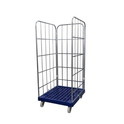 Transportbur med 3 sider med stålforstærket plastbund i valgfri farve. Transportburet er monteret med 2 drejehjul og 2 faste hjul, 108 mm PP. Mulighed for påtryk af logo eller tekst på buret.