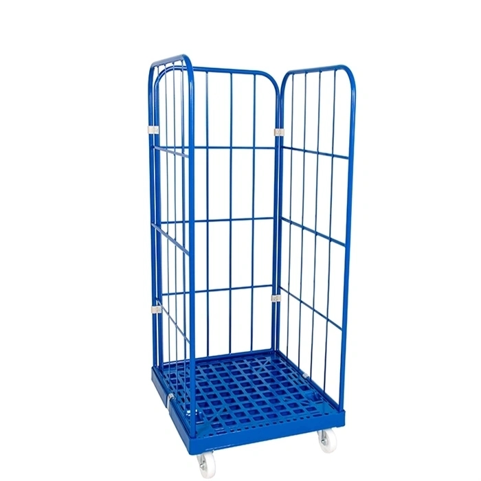 Smart transportbur med bund og 3 sider i blå farve (RAL 5010). Transportburet er 1350 mm højt og monteret med hvide 108 mm plasthjul.