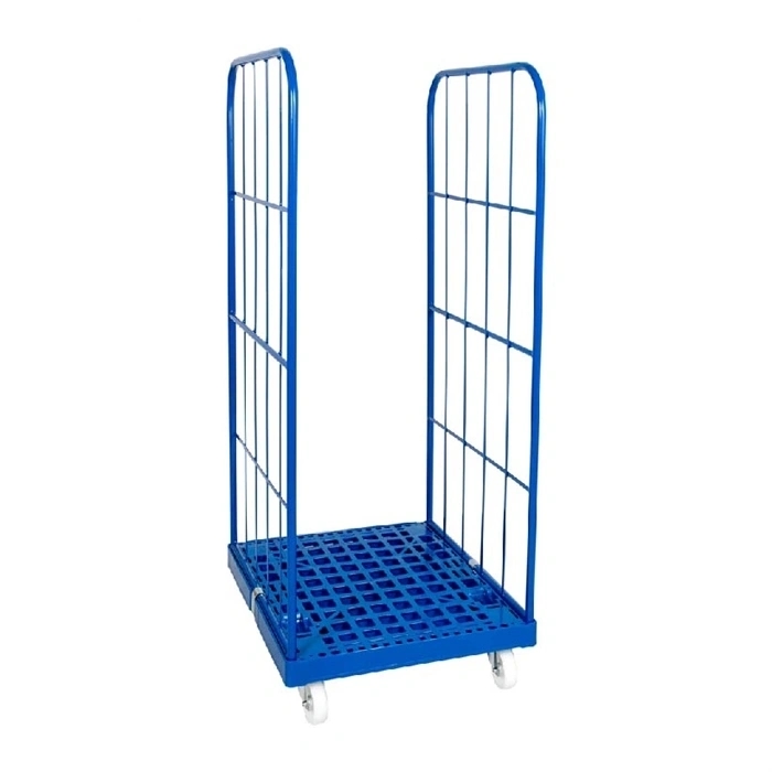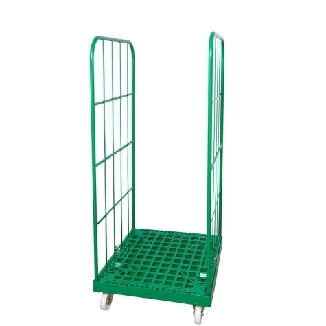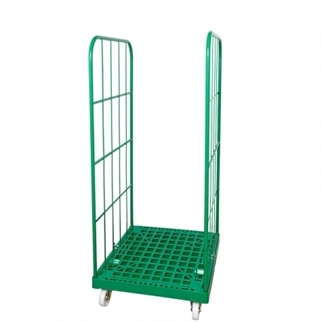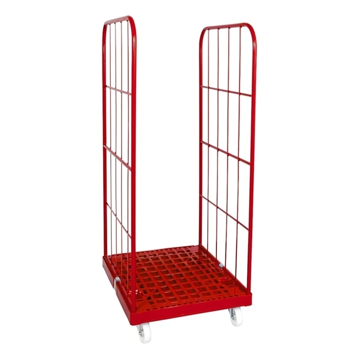 Smart transportbur med bund og 2 sider i rød farve (RAL 3000). Transportburet er 1450 mm højt og monteret med hvide 108 mm plasthjul.