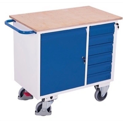 Praktisk og robust Værkstedsvogn 1110x600x960 mm (BxDxH) monteret med støjsvage og afsmitningsfrie gummihjul. Vognen er lavet i stålplader med pulverlakering, træbordplade og stålhåndtag, så det er nemt at skubbe vognen. Værkstedsvognen har et skab og 6 skuffer. Værkstedsvognen har en maks belastning på 400 kg.